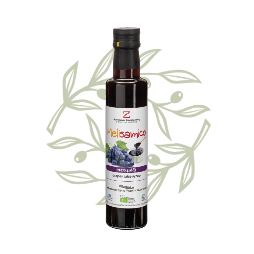 MELISAMICO Petimezi – BIO hroznový sirup vzniká tradičnou metódou pomalého zahusťovania muštu z červených hroznov pestovaných ekologicky v oblasti Kali Sykiá na južných svahoch prefektúry Rethymno (Kréta). Tento sirup bez pridaného cukru a konzervantov je súčasťou krétskej kuchyne už tisíce rokov a vyrába sa bez chemických zásahov.