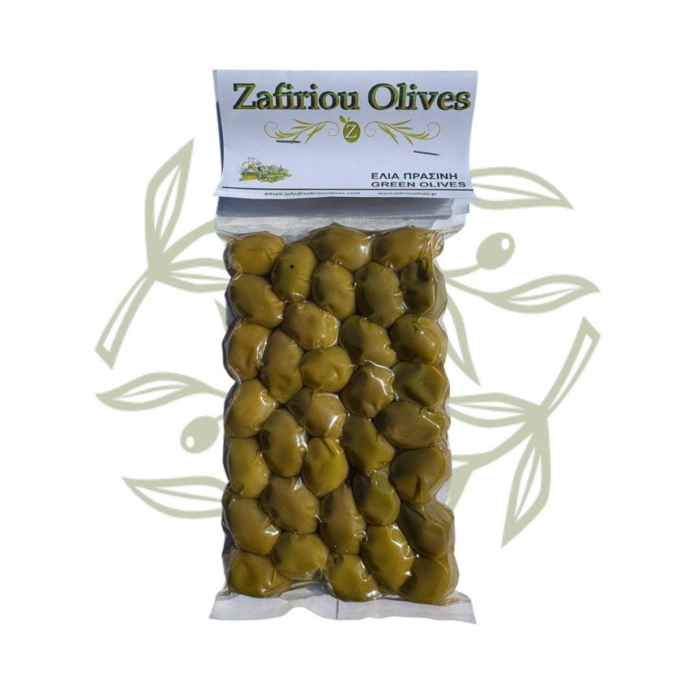 Zelené olivy Chalkidiki Zafiriou pochádzajú zo severu gréckeho polostrova Chalkidiki v oblasti Centrálnej Makedónie. Majú typický veľký mandľovitý tvar, pevnú dužinu, sviežo zelenú až žltozelenú farbu a jemne horko-slanú chuť, ktorá sa výborne hodí k syrom, aperitívom alebo do šalátov.