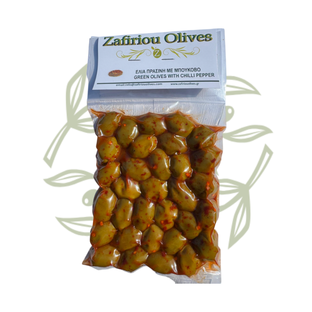Tradičné zelené olivy Chalkidiki s kôstkou, ochutené pikantnou chilli papričkou a naložené v jemne korenenej náleve so slnečnicovým olejom. Pevná štruktúra, mierne horkastá chuť a pikantný akcent – ideálne k vínu, syrom alebo grilovanému mäsu.